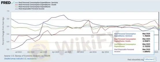 Gambar 1 di bawah ini menunjukkan pengeluaran konsumsi pribadi riil AS pada Mei (setelah disesuaikan inflasi), terbagi menjadi pengeluaran barang dan jasa. Seperti yang pernah kami jelaskan, ketika konsumsi barang melebihi konsumsi jasa, biasanya tren naik aset berisiko akan semakin menonjol. Sejak November 2024, kedua kategori ini mulai berselang-seling dan pasar risiko pun tetap berada di level tinggi. Data Mei menunjukkan bahwa konsumsi barang masih lebih tinggi dari jasa, menandakan momentum kenaikan aset berisiko belum pudar.