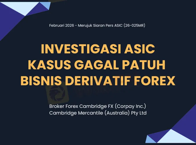 Merujuk pada media release ASIC 26-025MR (2026), regulator mengenakan kondisi lisensi terhadap anak perusahaan Corpay (Cambridge FX) menyusul temuan kegagalan kepatuhan.