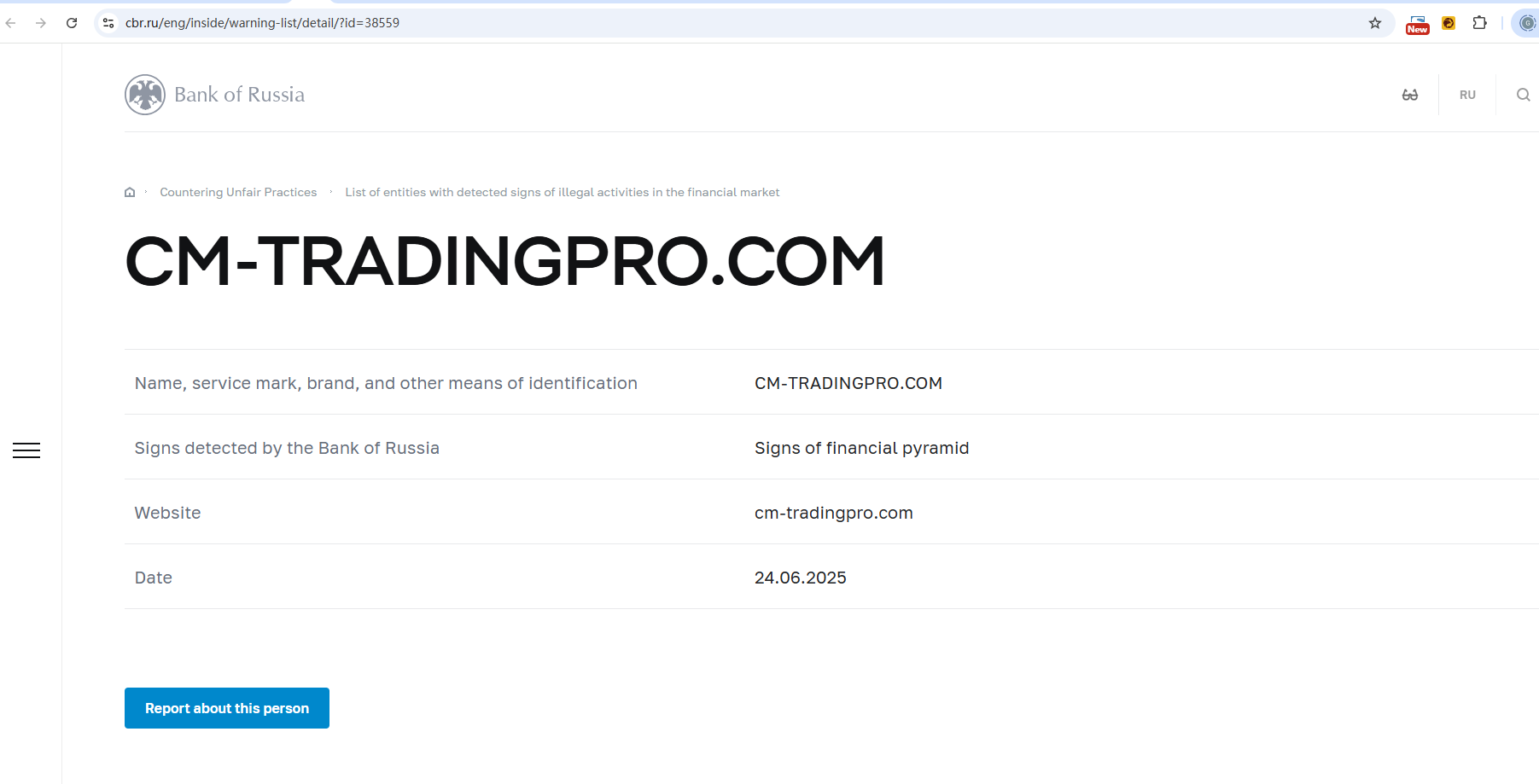 Nama, tanda layanan, merek, dan sarana identifikasi lainnya CM-TRADINGPRO.COM Tanda yang terdeteksi oleh Bank Rusia Tanda piramida keuangan Situs web cm-tradingpro.com Tanggal 24.06.2025