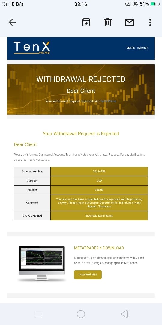 wd rejected karena diduga melakukan ilegal trading dan wd melampaui batas deposit akhirnya akun disuspend dan wd di reject