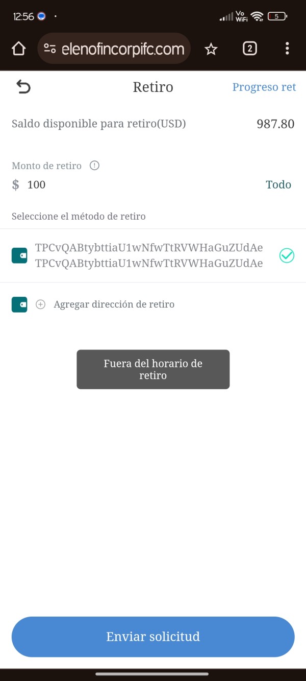 el 10.06.2024 se informo de un error en la base de datos debido a una actualización de la base de datos donde depositaron por error el monto en inversion, por lo tanto bloquearon los retiros, la forma de solucionar el problema es que depositemos el dinero consignado por error, para poder habilitar nuevamente los retiros, a la hora de hacer el retiro de lo invertido dice que no se esta en el horario de retiro y no dan solucion al tema.