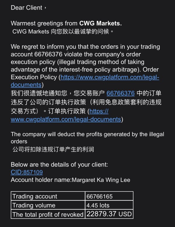 八月頭收到電郵通知戶口凍結,查詢後回覆未有正面解釋,7/8 直接在戶口扣除資金。本人要求CWG歸還資金。附上入金證明,CWG電郵通知及扣除金額紀錄。