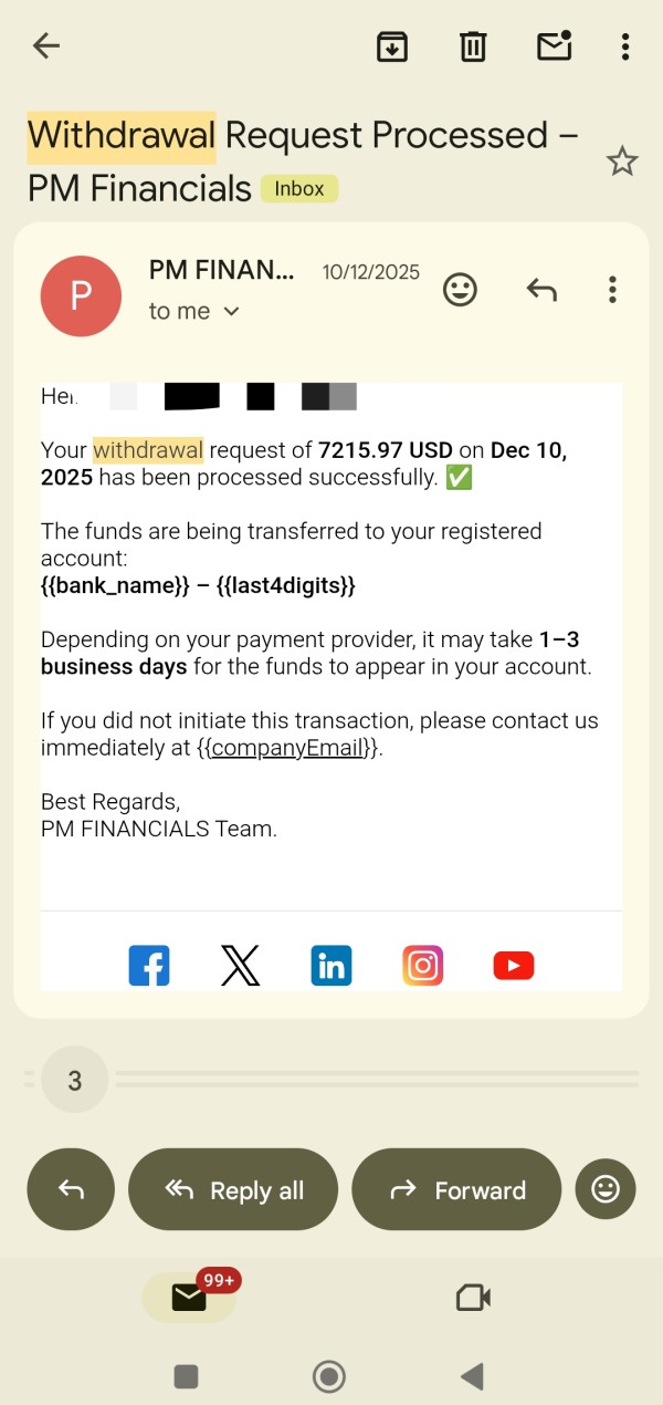 hii, I'm writing this because I was scammed by the pm financial. I deposit in my fully verified account. the account manager neeraj asked me to deposit. and I made 5k approx profit. when I withdraw I got approved mail . but after 40+days still now I don't get my funds. and the person called vise precident beg for deposits and never pay you back . this is true story. they scamming many people. here Im attaching proofs. I completed on fsc but there is no response from the regulation. so don't trust them . I'm taking this issue to civil law . I will arrest them all soon .