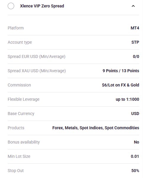 Xlenceは、Xlence Essential、Xlence Prime、Xlence Deluxe、Xlence Ultimateのようなさまざまなアカウントを提供しています。さらに、最低入金額のないイスラム教徒向けアカウントも提供しています。