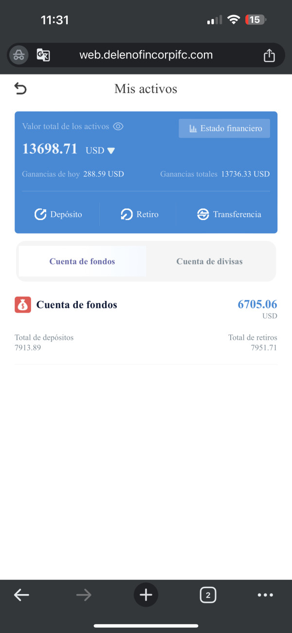 El 7 de julio Deleno tuvo una actualización que tuvo un error y el lunes a la 1 de la mañana nos llegó una cantidad inmensa de dinero, la cual dicen que debemos depositárselas a la plataforma para poder retirar, cosa que creo que es muy injusta ya que muchas personas no contamos con toda esa cantidad de dinero para depositar, en el momento tengo ese dinero que enviaron en fondos esperando que lo descuenten pero dicen que ellos no pueden descontarlos por sí mismo pero no nos deja retíralo para mandárselos y ahí está nuestro capital congelado sin poder hacer retiros, porfavor espere que WikiFX pueda mediar por nosotros y ayudarnos a tener una solución razonable.