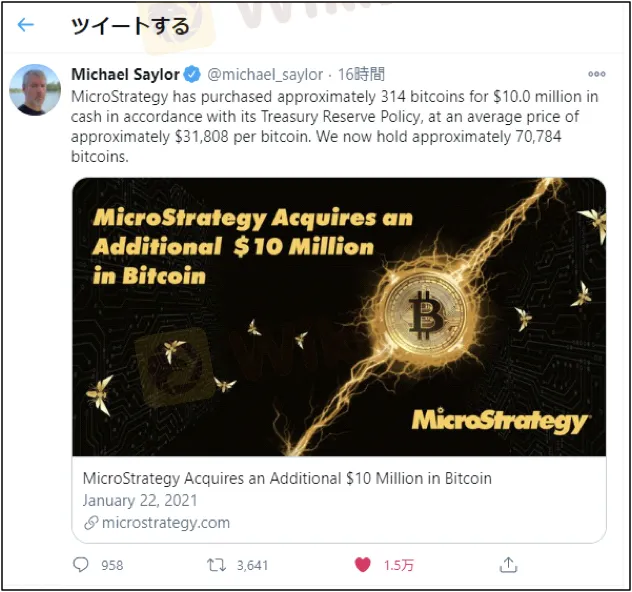 ナスダック上場ソフトウェアおよびクラウドサービスのマイクロストラテジー(MicroStrategy Incorporated)社のCEOマイケル・セイラー(Michael Saylor)氏は1月22日自分名義のツイッターにMicroStrategy社がビットコインを買い増ししたことを明らかにしました。