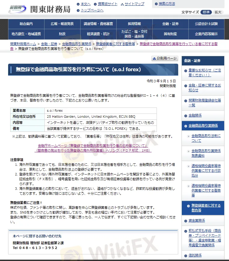 概要:【WikiFX】S.O.L forexが、2021年9月日本金融庁関東財務局が無登録で、金融商品サービスを提供する業者として、警告が出された。本日は該当業社の詳しく調査!