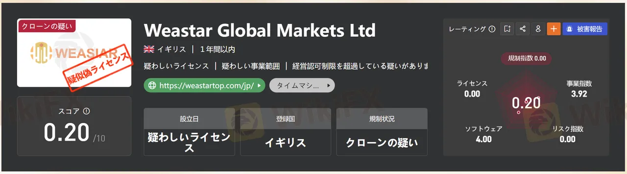 Weastar Global Markets Ltdは2023年に設立され、イギリスを拠点とする非規制のブローカーです。外国為替取引、仮想通貨、金属、株式、商品、指数など多様な取引商品を提供しています。