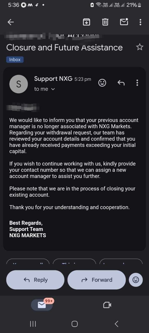 I am writing to formally raise my concern regarding the refusal of my withdrawal request. I have been informed that my Relationship Manager has left the organization, and this has been cited as the reason for the delay. Please note that the departure of an employee should not affect a clients right to access their funds. As a customer, I expect my withdrawal request to be processed promptly and without unnecessary obstacles. I kindly request: - Immediate clarification on the status of my withdrawal. - A clear timeline for when the funds will be released. - The contact details of the new representative assigned to my account. Failure to address this matter urgently will leave me with no option but to escalate the issue to the relevant regulatory authorities. I trust you will treat this request with the seriousness it deserves and provide a resolution at the earliest. nxg market is scamer broker and the owner name is lalit mata who is scamming more clients and his employee