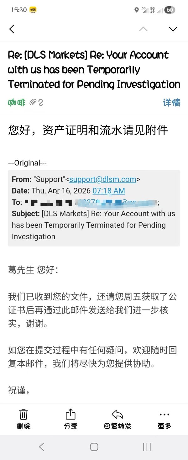 DLSM平台恶意封号+无限补资料,拒绝出金(已提交全部材料仍被拖延) 我是DLSM平台普通用户,于2026年4月1日账户被平台单方面限制,至今已接近一个月,期间平台始终未给出合理解释,亦未恢复账户功能或安排出金。 在此期间,我已完全配合平台要求,提交了包括身份信息、地址证明、资产证明等所有资料,甚至按照其要求进行了公证。然而,在我提交全部材料后,平台仍不断以“需进一步审核”为由,反复要求补充类似甚至重复的资料,明显存在恶意拖延行为。 我的账户交易情况如下: 正常交易,仅数次操作 先亏损后盈利 总盈利仅为 3858.02 USD 在此情况下,平台却对账户进行长时间限制(已达22天以上),严重违反基本交易公平原则。 为什么地址证明与资产证明不是在开户或入金时要求,而是在用户盈利后才触发?其审核标准和触发机制是什么? 平台是否具备审核用户资产来源的法律资格?是否所有用户都面临随时被要求提供敏感资料的风险? 交易行为属于用户自主决策,平台凭何要求解释交易逻辑与操作依据? 平台以“审核”为名长期冻结账户,是否构成限制出金? 若用户亏损,平台是否承担责任?若不承担,为何用户盈利却要被限制账户? 我已提交所有资料(含公证),平台持续要求重复或类似材料。账户被冻结,无法正常交易或出金,也没有明确的处理时间或结果。dlsm已严重影响我的资金安全与正常使用权益。 我明确表示,愿意放弃全部交易利润,仅要求平台退回本金,但截至目前,平台仍未处理。 若平台继续拖延或拒绝出金,我将采取以下措施: 在包括外汇天眼、FPA、Trustpilot等平台持续曝光 向相关监管机构投诉、启动法律及链上资金追踪手段 根据本人经历,DLSM平台存在明显的典型问题流程: 限制账户 → 要求公证资料 → 反复补资料 → 无限拖延 → 最终拒绝出金 建议所有投资者谨慎远离该平台,避免资金风险。