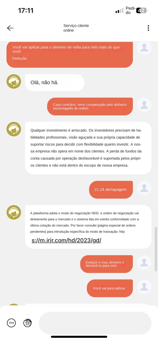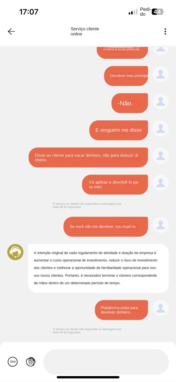 Ele exige constantemente que você deposite margem. Minha conta originalmente tinha $13,122.47. Quando tentei sacar, alegaram que meu volume de negociação não atendia ao requisito de três vezes e exigiram que eu depositasse 100% da margem de $13,122.47 dentro de sete dias. Depositei os $13,122.47 completos dentro do prazo especificado, mas quando tentei sacar novamente, ainda não consegui retirar o total de $26,244.94. Agora estão exigindo que eu deposite outros $5.000 dentro de 15 dias, ameaçando congelar minha conta permanentemente se eu não cumprir o prazo. Suspeito que mesmo depois de pagar os $5.000, ainda não conseguirei sacar, e eles já congelaram minha conta!