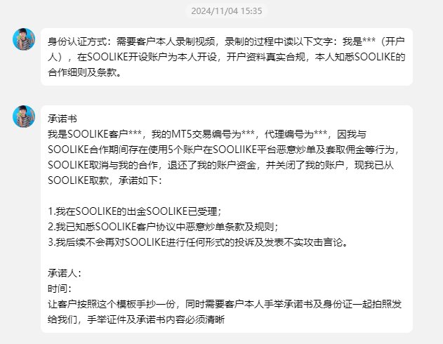 经朋友介绍在SOOLIKE平台开户入金交易,当时平台也刚好有个赠金活动,所以入金500美金,陆续有一些盈利,然而等我想尝试出金的时候,提交出金几分钟就被驳回,原因是套利账户,需要扣除赠金后交易3手才能出金。当时我很纳闷,才几分钟,根本就没审核就说我账户有问题,但是看到要求只要3手,并不严格,也就不管它,先继续交易够三手再出金,但是,当我满足3手交易量时,再提交出金,还是以我交易量不足为由拒绝出金,然后我问客服,客服说我的有效手数只有0.3手,我当时以为系统可能没更新,就继续交易3手,结果还是一样,无论发邮件或是问在线客服,都是说只做了0.3手。直到我交易了10多手,发现无论怎么交易平台就是说0.3手,发现不对劲平台可能故意恶心人,这个时候客户经理才说,套利账户必须只能出本金,而且还需要本人录制视频,手写协议才能出本金。没办法,只能先妥协,把本金出了。对于SOOLIKE这样恶心人,毫无证据的情况下扣除盈利,而且还要变着法子玩弄客户,这样的行为,我表示不能容忍!我希望斑马投诉帮我讨回公道,追回被扣盈利,也希望各位投资者擦亮眼睛看清楚黑平台嘴脸!远离黑平台!