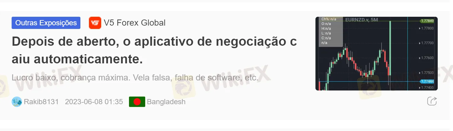 De acordo com o WikiFX App, hoje um Bangladesh relatou na plataforma de exposição WikiFX que o aplicativo móvel da corretora V5 Forex Global continuou a falhar e não pôde ser usado normalmente.