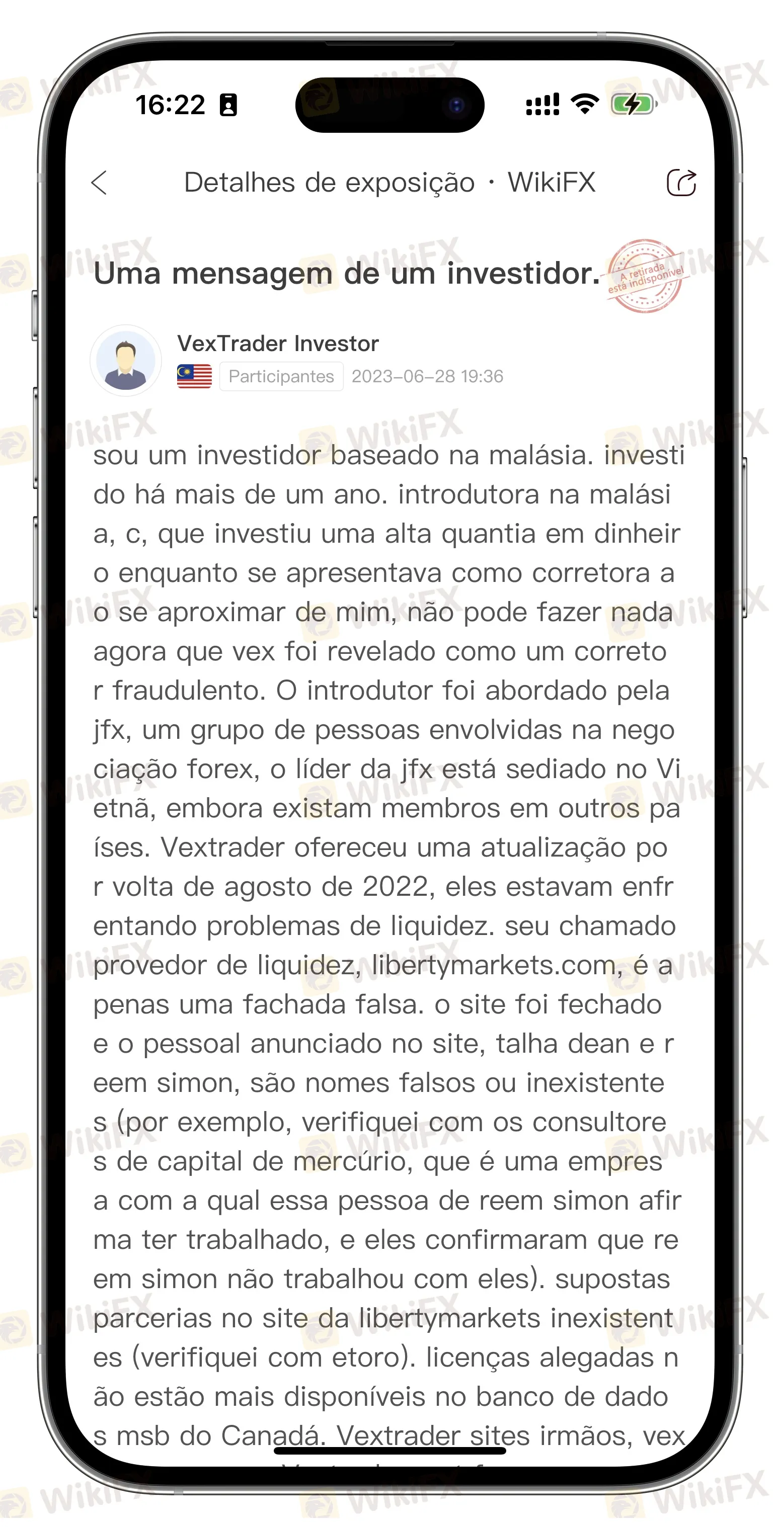 Infelizmente, algumas vítimas continuam imersas na tristeza e têm dificuldade em superar essa situação. Recentemente, um investidor da Malásia chamado “VexTrader investidor” deixou outro comentário no WikiFX, detalhando sua experiência de ter sido enganado e ainda aguardando que a Vextrader devolva seus fundos.