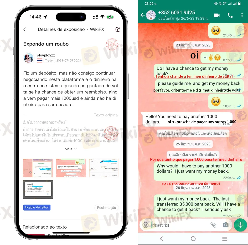 De acordo com o investidor, ele fez um depósito na plataforma Dux Holding, mas não pôde continuar com as negociações e o dinheiro não foi creditado em sua conta. Quando ele tentou solicitar o reembolso, a plataforma informou que ele precisaria pagar uma taxa adicional de 1000 dólares. Até o momento, ele não conseguiu recuperar seu dinheiro e forneceu registros de comunicação e capturas de tela da conta. Algumas capturas de tela estão disponíveis abaixo, e mais detalhes podem ser encontrados no site oficial da WikiFX.
