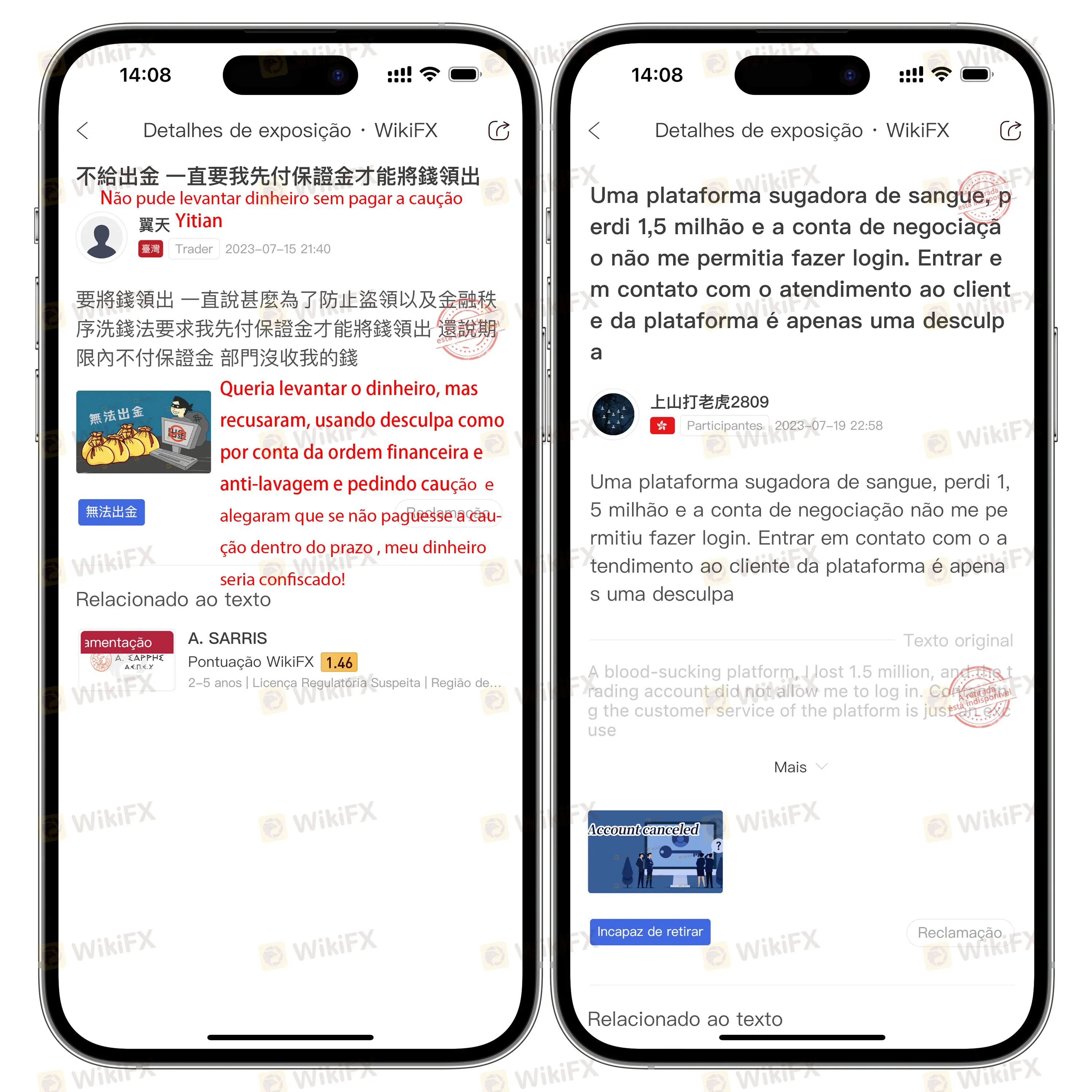 Recentemente, vários investidores expuseram problemas de negação de pedidos de saque em relação à plataforma “A. SARRIS” no WikiFX. Um dos lesados afirmou que “A. SARRIS” restringiu diretamente o acesso à sua conta de negociação, resultando em uma perda de até 1,5 milhão.