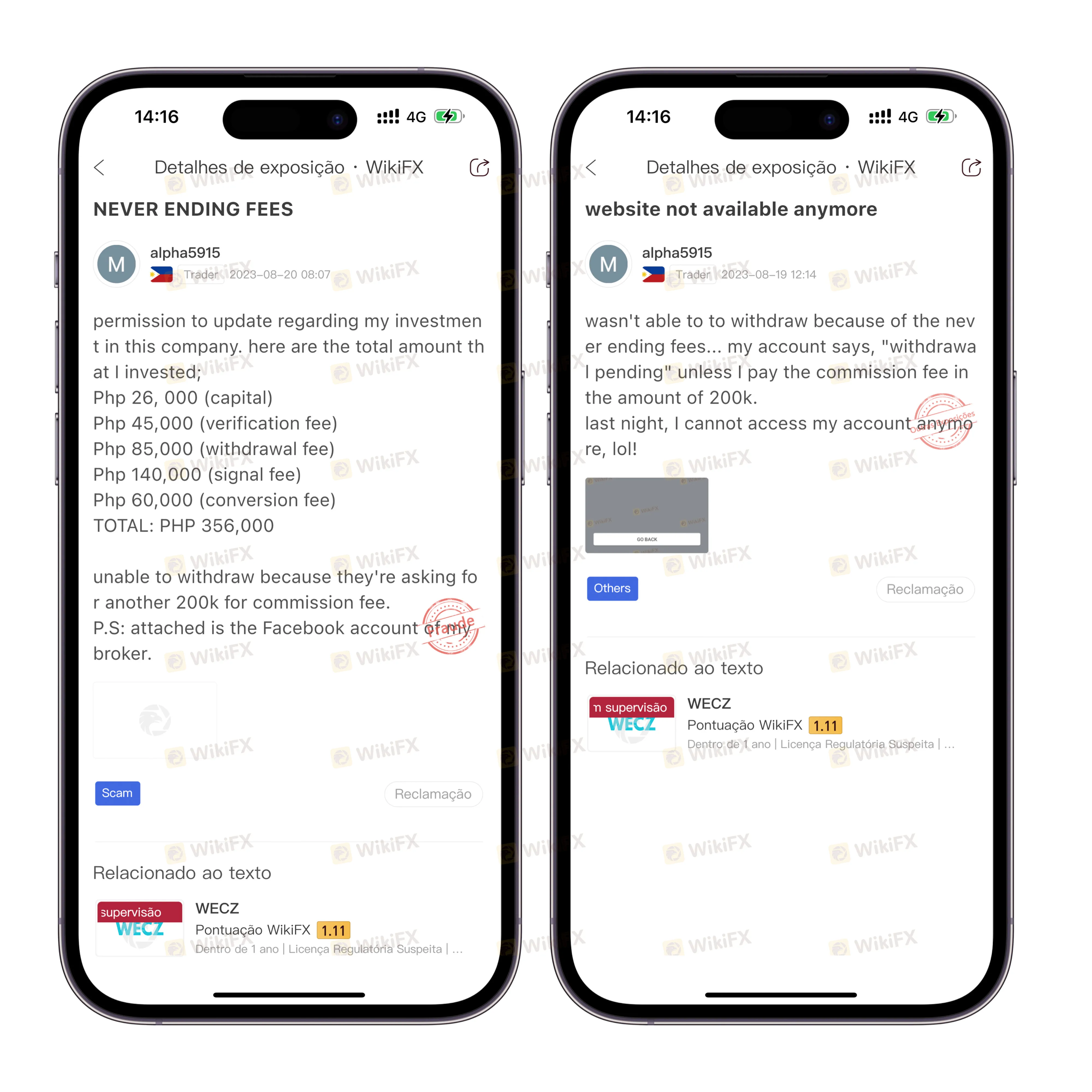 Há alguns dias, um investidor “alpha5915” das Filipinas reclamou ao WikiFX para expor a plataforma WECZ. Ao sacar fundos, a conta sempre mostrava “retirada pendente” e cobrava várias taxas sem parar, mas ainda não conseguia sacar fundos e finalmente, a conta não pôde ser acessada.