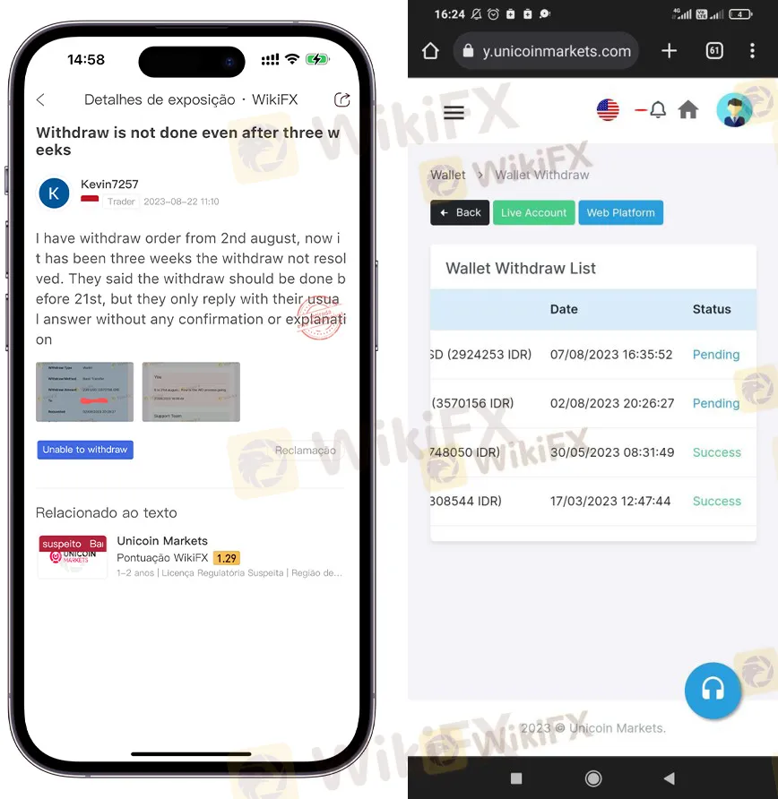 Alguns dias atrás, um investidor indonésio “Kevin7257” reclamou ao WikiFX que a plataforma “Unicoin Markets” não conseguia sacar fundos.