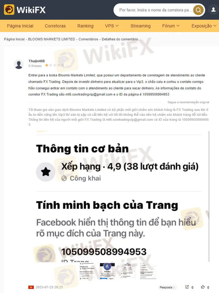 Um dos investidores afirma que se associou à plataforma BLOOMS MARKETS LIMITED, e o departamento de atendimento ao cliente e corretagem da FX Trading entrou em contato com ele. Após pagar as taxas para se tornar um VIP3, a plataforma desapareceu repentinamente, todas as formas de contato ficaram inválidas, resultando na incapacidade de retirar os fundos da conta do investidor. De acordo com as informações fornecidas pela vítima, o endereço de e-mail usado pelo investidor na plataforma BLOOMS MARKETS LIMITED era mt6.cowtradingvip@gmail.com, com ID 10599508994953. Atualmente, o site da plataforma não pode mais ser acessado.