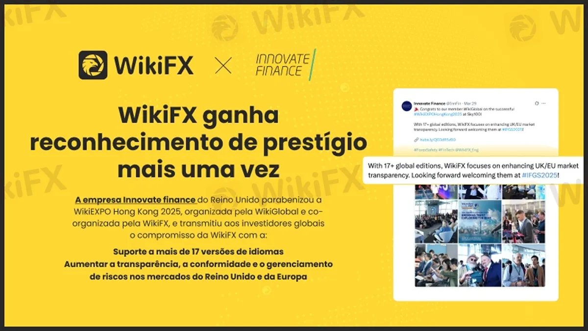 Recentemente, a Innovate Finance, principal associação da indústria de Fintechs do Reino Unido, parabenizou calorosamente o sucesso da WikiEXPO Hong Kong 2025 — organizada pela WikiGlobal e coorganizada pela WikiFX — por meio de seus canais oficiais nas redes sociais. A associação destacou que a WikiFX, reconhecida globalmente como uma plataforma de informações sobre negociação forex, atende usuários em mais de 180 países e regiões com versões em 17 idiomas. A plataforma se compromete com o aumento da transparência, conformidade e gestão de riscos nos mercados financeiros do Reino Unido e da Europa, ajudando investidores a identificar ambientes seguros e confiáveis para negociar forex.