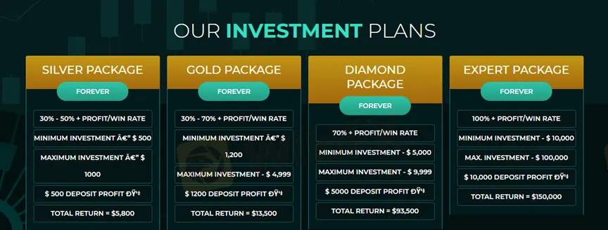 четыре инвестиционных плана, предлагаемых FX-Profit Trade , а именно серебряный пакет, золотой пакет, алмазный пакет и экспертный пакет. для запуска серебряного пакета требуется минимальная сумма инвестиций в размере 500 долларов США, в то время как для трех других инвестиционных планов минимальные требования к начальному капиталу составляют 1200 долларов США, 5000 долларов США и 10 000 долларов США соответственно. максимальные инвестиции составляют 1000 долларов США, 4999 долларов США, 9999 долларов США и 100 000 долларов США по отдельности.