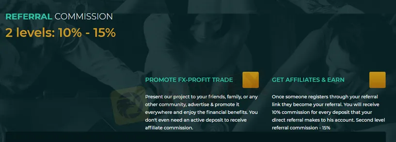 FX-Profit Tradeпредлагает своим клиентам два уровня реферальных комиссий. если кто-то зарегистрируется по вашей реферальной ссылке, то он станет вашим рефералом, и вы получите комиссию 10% за первый уровень, а реферальная комиссия второго уровня составляет 15%.