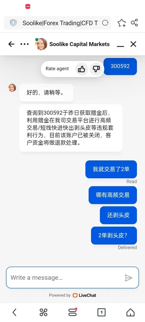 总共交易了2单,平台判定我高频交易,MD盈利不给出,黑平台。大家千万不能在这个平台注册,以此为戒。 问客服为啥只交易2单,平台交易不了了,客服说我是高频交易,账号停了。我TM服了,8月12号交易一单,13号交易一单,盈利了几百美金,判定我高频交易。你们这丑陋的嘴脸真让人恶心。😡😡😡