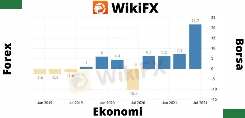 Faaliyet ve talebin geçen 2020 yılında COVID-19 kısıtlamalarının neden olduğu sert düşüşten sert bir şekilde toparlanmasıyla Türkiye ekonomisi, önceki üç aylık dönemde yukarı yönlü revize edilen yüzde 7,2'lik büyümenin ardından 2021 yılının ikinci çeyreğinde yıllık bazda yüzde 21,7'lik rekor bir büyüme kaydetti. Ülke ayrıca bu yılın başlarında sokağa çıkma yasağı, hafta sonu kilitlenmeleri ve restoran kapanışları da uygulamasına ragmen, ancak bu önlemler Haziran ayında tamamen kaldırıldı ve üretimi ve daha geniş ekonomiyi etkilemiyor gibi görünmekte. Büyümenin ana itici güçleri sırasıyla yüzde 22,8ve yüzde 20,2 oranında artan hanehalkı tüketimi ve sabit yatırımlardı. Ayrıca ihracatın ithalattan daha fazla artması nedeniyle kamu harcamaları yüzde 4,2 oranında artmış ve net ticaret GSYİH'ya da olumlu katkı sağlamıştır. Ayrıca son yıllara göre Türkiye'nin Ekonomisi ihracat sayesinde rekor büyüme sağlamıştır.
