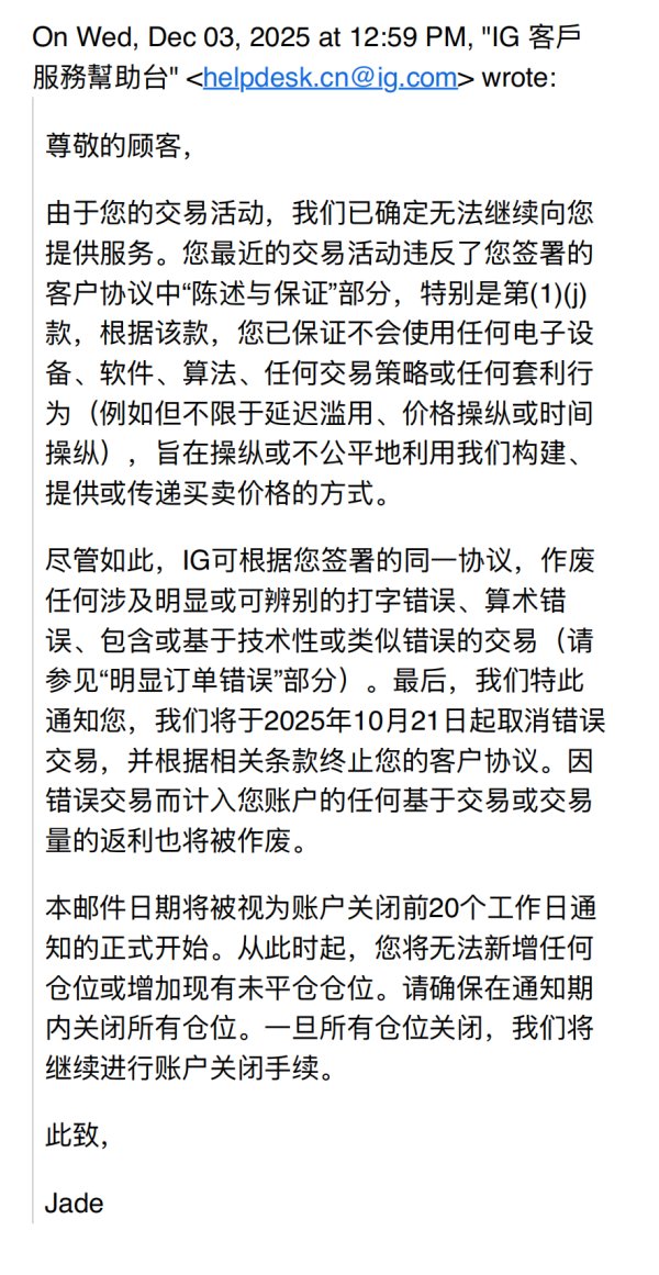 我在2025年8月29日注册成为IG Group的一名用户,并在几天后尝试入金交易。 虽然一开始产生了一些亏损,但我在交易和出入金方面一切顺利。直到2025年10月28日,我无法再使用我的任何交易账户进行交易,也无法从我的任何交易账户提取资金。当时,我的账户仍有108208.70美元。当我向IG Group客服部门表达疑问时,客服以合规部门审查为理由,让我耐心等待 我不认为我的账户有任何问题,而我也并未收到IG公司对我的询问,当然我愿意配合这些。但只是一味的在等待,我等待了一个月 2025年12月3日,我收到了以下邮件,相关部门扣除了我的账户资金高达271373.4美元(目前我的账户资金为-163164.7美元) 根据IG邮件表述,我违反了《客户协议》,且认定我的订单属于交易错误。他们在当天扣除了我自2025年10月21日起的交易盈利以及交易量返利 诉求:退还本人所有被扣除的资金,允许本人出金