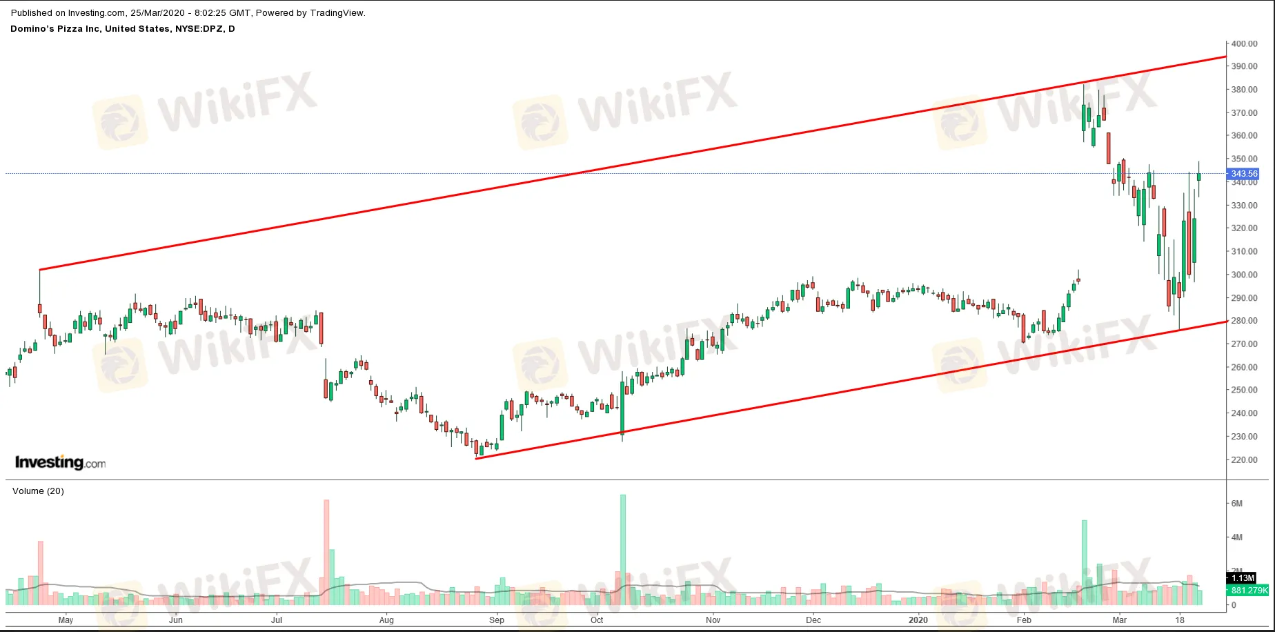 1. Dominos Pizzaโดมิโนพิซซ่า (NYSE:DPZ) เป็นที่รู้จักกันดีในสหรัฐฯ ในฐานะบริษัทผู้ส่งพิซซ่าเป็นหลักของธุรกิจมากถึง 55% ยิ่งสถานการณ์ไวรัสระบาดในปัจจุบันที่บีบให้มนุษย์จำเป็นต้องอยู่กับบ้านยิ่งทำให้ยอดสั่งซื้อพิซซ่าของบริษัทพุ่งสูงขึ้นอย่างมีนัยสำคัญ ในช่วงครึ่งเดือนล่าสุดหุ้นโดมิโนพิซซ่าปรับตัวสูงขึ้น 22% มีราคาปิดเมื่อคืนนี้อยู่ที่ $343.56 และมีมูลค่าทางการตลาดทั้งหมดอยู่ที่ $1,340 ล้านเหรียญสหรัฐ