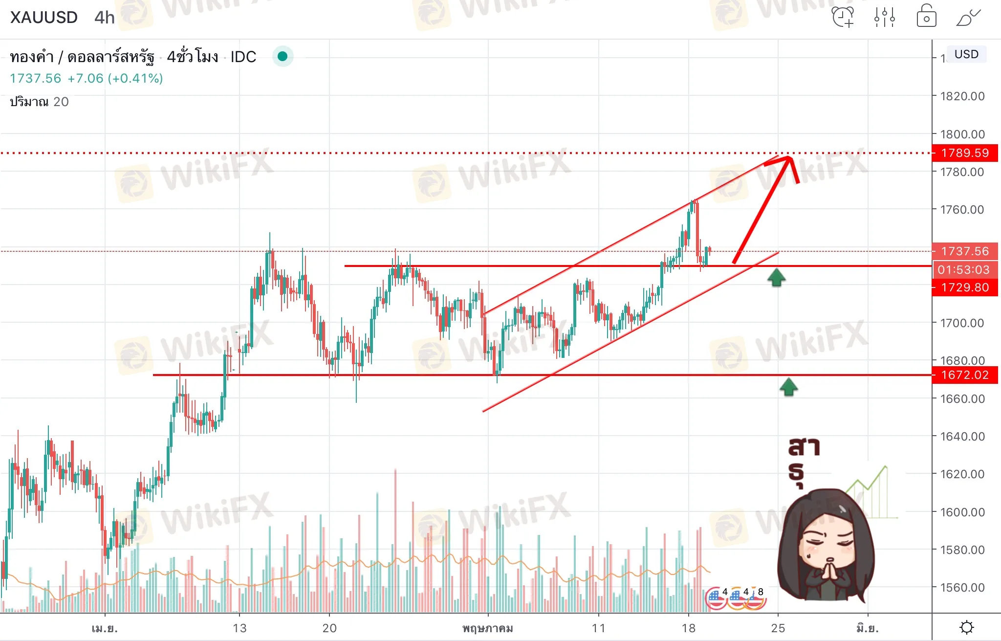 ราคาลงมาถึงบริเวณที่เคยเป็นแนวต้านเก่า เปลี่ยนสถานะเป็นแนวรับใหม่เรียบร้อยที่ราคา1736