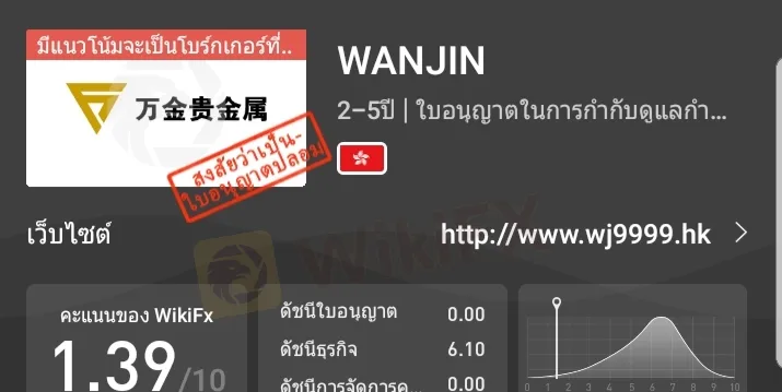 โบรกเกอร์ WANJIN Wanjin Precious Metal จากการตรวจสอบของ WikiFX มีคะแนนอยู่ที่ 1.39 และใบอนุญาตที่ถือไว้นั้นเป็นที่น่าสงสัยว่าเป็นของปลอมแปลง ด้านซอฟต์แวร์การซื้อขายที่โบรกเกอร์ใช้ ไม่ใช่ MT4 / 5 ความปลอดภัยของซอฟต์แวร์ดังกล่าวเป็นที่น่าสงสัยและมีความเสี่ยงสูง