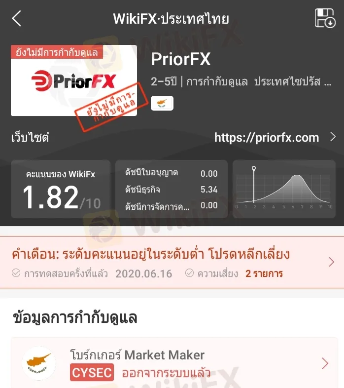 PriorFX บนแอพ WikiFXได้รับ 1.82 คะแนน ขณะนี้ยังไม่มีการกำกับดูแลที่มีประสิทธิภาพจริง มีความเสี่ยงมากควรที่จะอยู่ให้ห่าง !