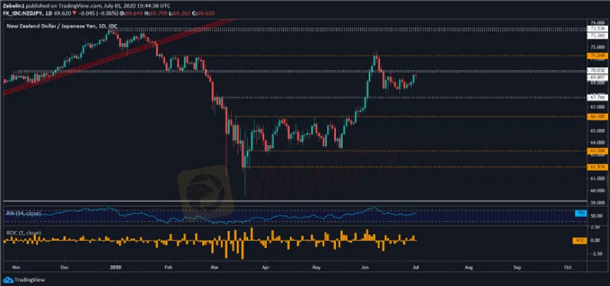 ในแง่ของ NZD/JPY คู่สกุลเงินที่พึ่งจะร่วงลงจากแนวต้านที่ 71.249 และค่าโมเมนตัมของราคาได้จนตรอกอยู่ในพื้นที่แนวต้านนี้ หาก NZD/JPY ทำให้ค่าโมโมเมนตัมสูงกว่าระดับสูงสุดของแนวต้านนี้และทะลุระดับ 71.249 ก็อาจจะเป็นการกระตุ้นความเชื่อมั่นและหนุนค่าเงินให้สูงขึ้นกว่าเดิม