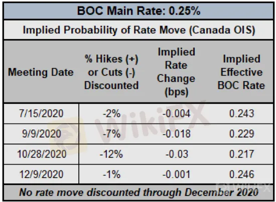 ตั้งแต่ปลายเดือนเมษายนความคาดหวังของตลาดอัตราดอกเบี้ยของธนาคารกลางแคนาดานั้นลดลง เมื่อพิจารณาการเพิ่มขึ้นของตลาดหุ้นทั่วโลกและตลาดพลังงาน ดอลลาร์แคนาดามีฐานสนับสนุนมากขึ้น ความน่าจะเป็นที่ธนาคารกลางคาดว่าจะปรับลดอัตราดอกเบี้ยลง 25 คะแนนในเดือนกุมภาพันธ์ 212 มีเพียง 1%