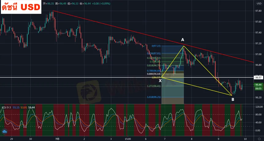 รูปแบบกราฟรายชั่วโมงของดัชนีค่าเงินดอลลาร์สหรัฐแสดงให้เห็นว่าราคาของเงินดอลลาร์สหรัฐแกว่งตัวลงหลังจากถึงระดับ 97.15 (จุด A) ในวันที่ 7 กรกฎาคมและลดลงเล็กน้อยที่ 96.24 (จุด B) ในวันที่ 9 กรกฎาคมหลังจากดีดตัวขึ้นเล็กน้อย 1.618XA = AB, X ต่ำ 96.57 ในวันที่ 6 กรกฎาคม
