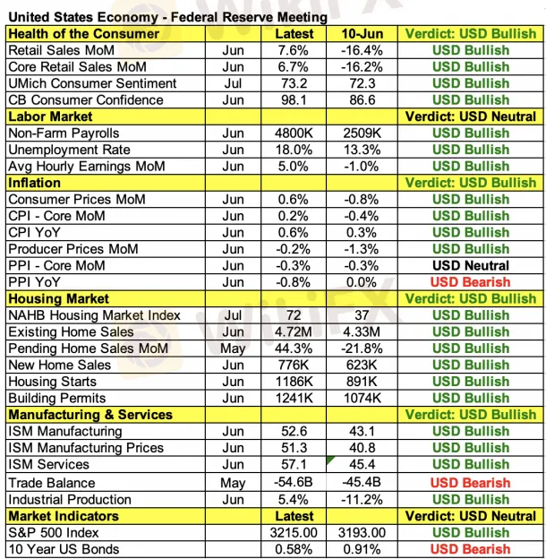 ตารางด้านล่างนี้แสดงให้เห็นถึงเศรษฐกิจสหรัฐฯ ที่ดีขึ้นหลังจากการประชุมของเฟดครั้งล่าสุดซึ่งเป็นช่วงเวลาที่สหรัฐฯ สามารถควบคุมยอดผู้ติดเชื้อโควิดเอาไว้ได้ แทนที่การประชุมในช่วงเช้าของวันพรุ่งนี้เฟดจะได้พูดถึงเรื่องความคืบหน้าของการฟื้นฟูเศรษฐกิจแต่กลับต้องมานั่งพูดถึงภัยคุกคามทางเศรษฐกิจครั้งใหม่ที่เกิดขึ้นจากการไม่เห็นความสำคัญในการควบคุมโรคระบาดและนโยบายทางการเงินของรัฐบาลสหรัฐฯ