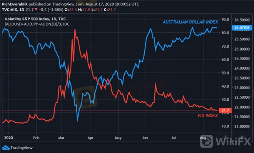 (ภาพแสดงการเปรียบเทียบระหว่างราคาดอลลาร์ออสเตรเลียและดัชนี VIX)
