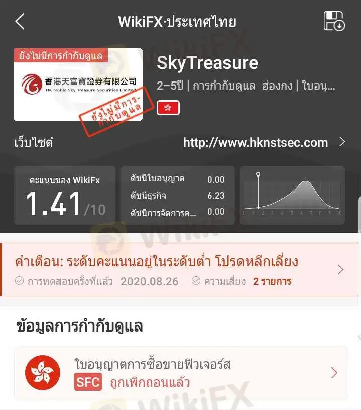 Sky Treasure ได้คะแนนบนแอป WikiFX 1.41 คะแนน หลังจากถูกเพิกถอนใบอนุญาตแล้วขณะนี้ยังไม่มีการกำกับดูแลและความเสี่ยงที่มีประสิทธิภาพจริงขอแนะนำให้อยู่ห่าง ๆ
