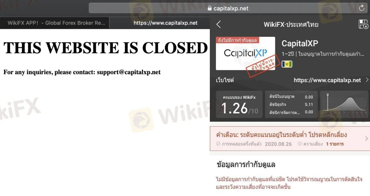 โบรกเกอร์ CapitalXP เป็นโบรกเกอร์ที่เปิดมาไม่นาน ส่วนใหญ่คนไทยอาจไม่นิยมเท่าไหร่ แต่ทาง WikiFX ตรวจสอบแล้วว่าโบรกเกอร์ดังกล่าวไม่มีใบอนุญาต คะแนนเพียง 1.26 นี้เป็นอีกเหตุผลที่โบรกเกอร์ที่ไม่มีคุณภาพอาจจะปิดตัวลงโดยที่นักลงทุนยังไม่ได้ถอนเงินออก เพราะโบรกเกอร์ที่มีคุณภาพจะต้องมีใบอนุญาต!
