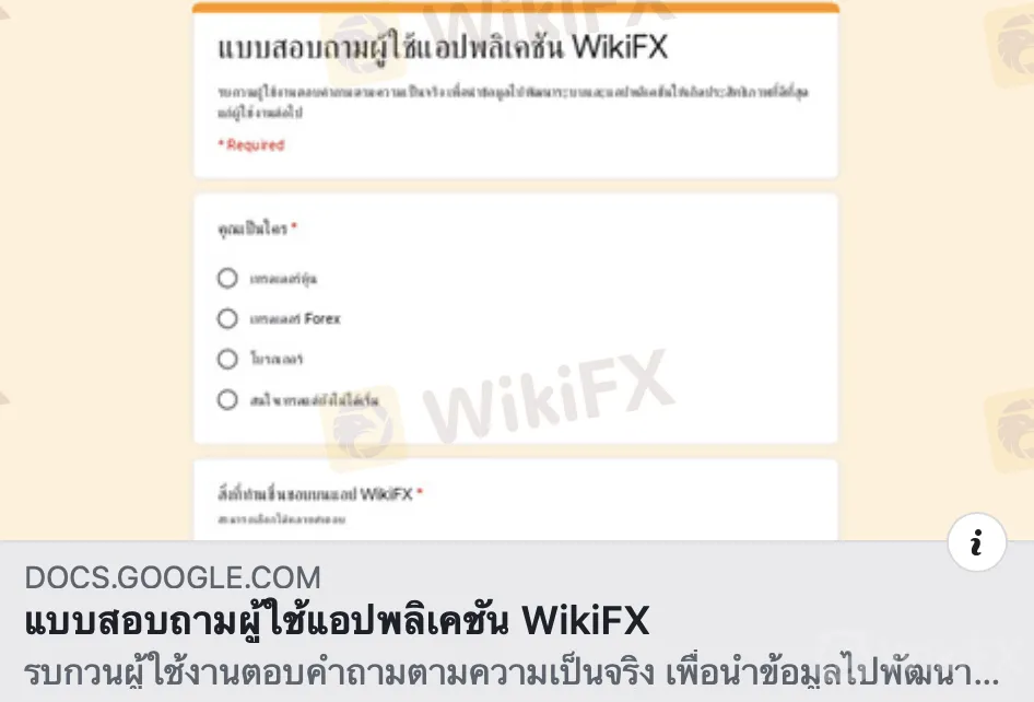 คลิ๊กลิ้งด้านล่างหรือเข้ามาที่เพจ WikiFX.th เพื่อหาแบบสอบถามและเมื่อทำแบบสอบถามเสร็จสามารถ Inbox ทางเพจ WikiFX.th เพื่อขอรับรหัส VIP ของแอป WikiFX 1 ปีเพื่อตรวจสอบโบรกเกอร์ได้แบบว่าลึกสุดๆ
