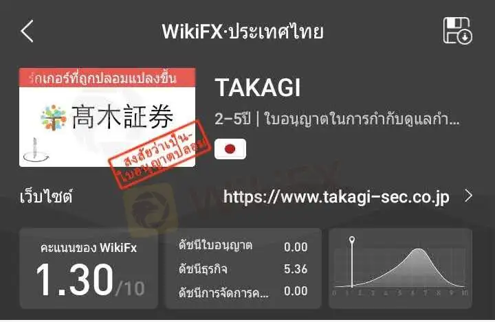 TAKAGI ได้คะแนนบนแอปพลิเคชัน WikiFX 1.30 คะแนน หลังจากถูกเพิกถอนใบอนุญาตแล้วขณะนี้ยังไม่มีการกำกับดูแลที่มีประสิทธิภาพจริงมีความเสี่ยงสูงขอแนะนำให้อยู่ห่าง ๆ