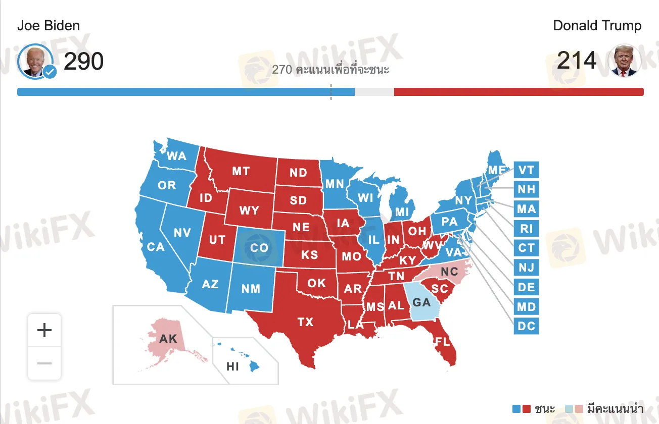 ตามข้อมูลล่าสุดจาก Fox News ไบเดนเอาชนะทรัมป์ด้วยคะแนนเสียง 290 คะแนน โดยทั่วไปตลาดเชื่อว่าไบเดนจะนำเสนอนโยบายการค้าระหว่างประเทศที่นุ่มนวลขึ้นซึ่งได้กระตุ้นความเชื่อมั่นที่มีความเสี่ยงของตลาด นอกจากนี้ตลาดยังกังวลว่าการแตกแยกของรัฐสภาสหรัฐฯจะรุนแรงขึ้นซึ่งจะสร้างแรงกดดันต่อดอลลาร์สหรัฐฯ ดัชนีดอลลาร์สหรัฐร่วงลงเล็กน้อยในวันจันทร์โดยทำระดับต่ำสุดในรอบสองเดือนมาที่ 92.17