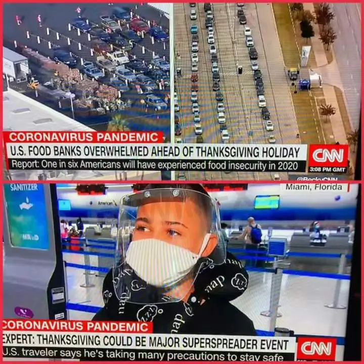 มีภาพข่าวประชาชนมากมายที่ต่อคิวขอรับบริจาคอาหาร มีตัวเลขว่าคนอเมริกัน 1 ใน 6 จะเกิดภาวะ Food insecurity ยิ่งช่วงนี้มีเทศกาล Thanksgiving ทาง CDC หมอเขารณรงค์ให้ไม่เดินทางกลับบ้าน แต่คนที่เดินทางกลับไปหาครอบครัว เช่น โดยเครื่องบิน คือมีเป็นล้านๆ ซึ่งผู้เชี่ยวชาญคิดว่าน่าจะเกิดระบาดหนักในอเมริกาหลังจากนี้