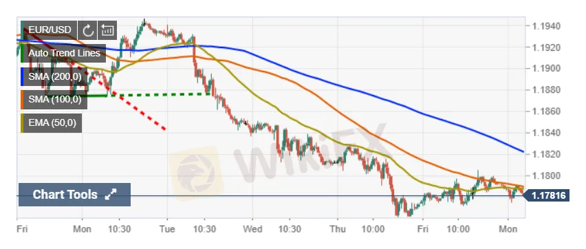 EUR / USD กำลังประสบกับโมเมนตัมขาลงในกราฟสี่ชั่วโมงและซื้อขายต่ำกว่าค่าเฉลี่ยเคลื่อนที่อย่างง่าย 50, 100 และ 200 ดัชนี Relative Strengh อยู่เหนือ 30