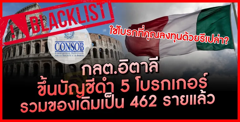 Consob ซึ่งเป็นหน่วยงานระดับสูงของรัฐบาลอิตาลีที่รับผิดชอบในการควบคุมตลาดหลักทรัพยในประเทศ ได้ประกาศปิดกั้น และขึ้นบัญชีดำ 6 เว็บไซต์ที่ให้บริการทางการเงิน และนำเสนอผลิตภัณฑ์การเงินอย่างผิดกฎหมาย รวมทั้งหมดที่บล็อคไปแล้ว 522 เจ้า! จะมีเจ้าไหนบ้าง ไปดูกัน!