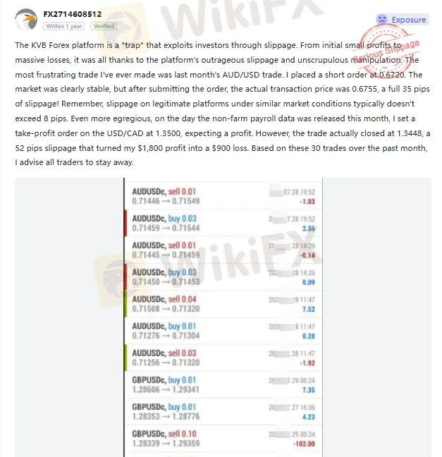 เนื้อหาการรีวิว: แพลตฟอร์ม KVB Forex เป็น “กับดัก” ที่เอาเปรียบนักลงทุนผ่าน Slippage ตั้งแต่กำไรเล็กๆ น้อยๆ ในตอนแรกไปจนถึงขาดทุนมหาศาล ทั้งหมดนี้ต้องขอบคุณ Slippage ที่น่าตกใจและการจัดการที่ไร้ยางอายของแพลตฟอร์ม การเทรดที่น่าหงุดหงิดที่สุดที่ผมเคยทำคือการซื้อขาย AUD/USD เมื่อเดือนที่แล้ว ผมวางคำสั่งขายที่ 0.6720 ตลาดค่อนข้างมีเสถียรภาพ แต่หลังจากส่งคำสั่ง ราคาซื้อขายจริงอยู่ที่ 0.6755 ซึ่งเป็น Slippage สูงถึง 35 pips! จำไว้ว่า Slippage บนแพลตฟอร์มที่ถูกต้องตามกฎหมายภายใต้สภาวะตลาดที่คล้ายคลึงกันโดยทั่วไปจะไม่เกิน 8 pips ที่ร้ายแรงกว่านั้นคือ ในวันที่ข้อมูลการจ้างงานนอกภาคเกษตรเผยแพร่ในเดือนนี้ ผมตั้งคำสั่ง Take Profit สำหรับ USD/CAD ที่ 1.3500 โดยหวังว่าจะได้กำไร อย่างไรก็ตาม การซื้อขายปิดที่ 1.3448 ซึ่งเป็น Slippage 52 pips ที่พลิกกลับมากำไร 1,800 ดอลลาร์ของผมกลายเป็นขาดทุน 900 ดอลลาร์ จากการซื้อขาย 30 ครั้งในเดือนที่ผ่านมา ผมแนะนำให้เทรดเดอร์ทุกคนหลีกเลี่ยง