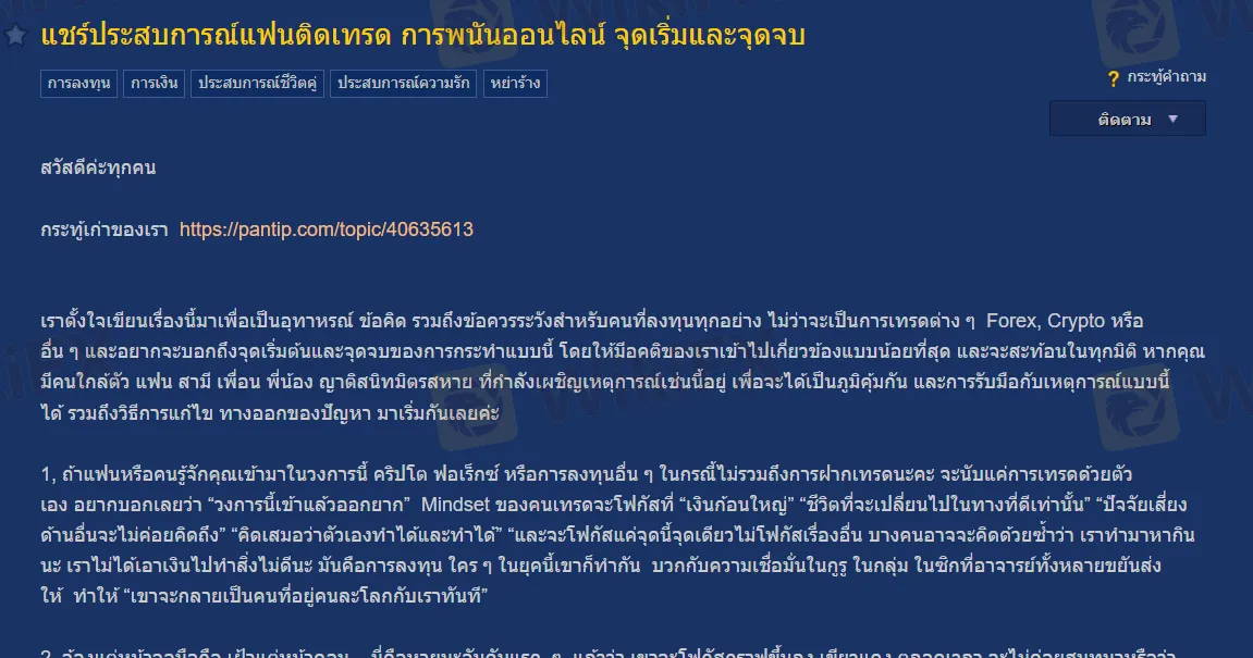 เจ้าของกระทู้ยอมรับว่า ตัวเธอเองเคยสนับสนุนทั้งกำลังใจและเงินทุน แม้คนรักจะล้มเหลวซ้ำแล้วซ้ำเล่า โดยหวังว่าสักวันทุกอย่างจะดีขึ้น แต่เมื่อเวลาผ่านไป เธอเริ่มรู้ว่า การสนับสนุนโดยไม่ตั้งคำถาม อาจไม่ใช่ความรักที่ดีเสมอไป โดยเฉพาะเมื่อคนเทรดไม่ยอมปรับวิธีคิดหรือพฤติกรรม