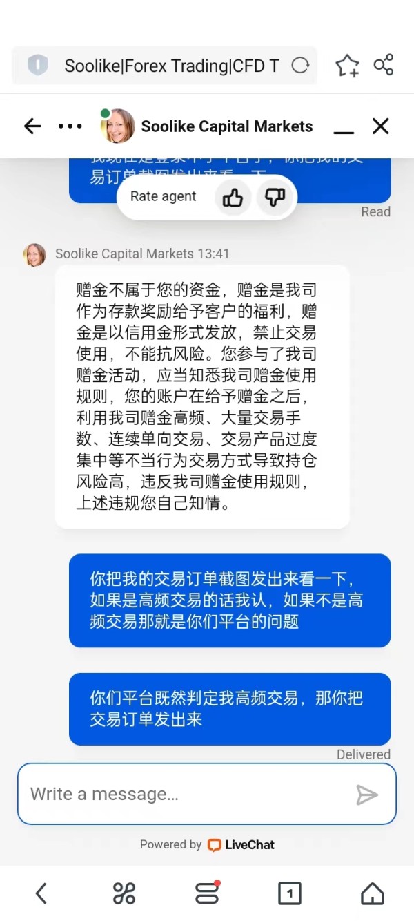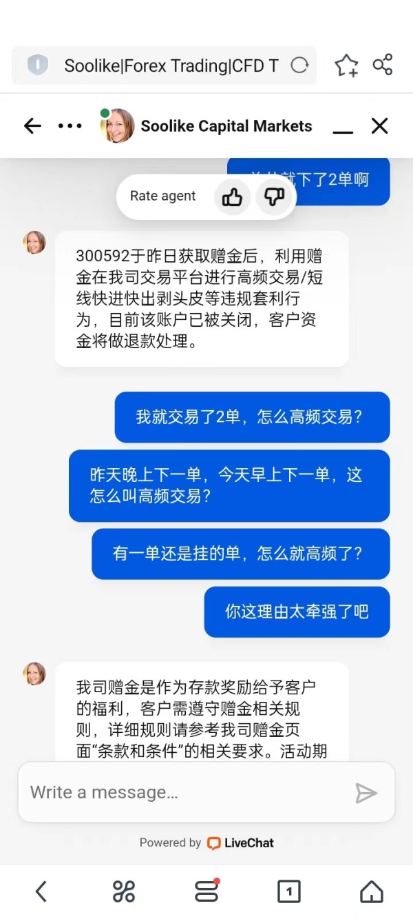 8月12号晚上,黄金有数据,做了一单,盈利了几百美金,然后在2470左右挂了一单,13号凌晨单子进场,早上看趋势不对,盈利一点就赶紧平仓。然后,就一直下不了单。当我登录平台,询问客服的时候,客服回复我说我高频交易,剥头皮,这种交易行为是平台不允许的,对我做出关闭账号处理。WTF,总共我从12号交易到13号也 就交易了2单,平台判我高频交易,而且,后面这一单还是挂单交易,每单持仓都超过了5分钟。当我再次准备登录账号的时候,显示授权失败,账号无法登录(见附图)。 你封我账号可以,关键你这个高频交易,我真的是无法接受。既然平台耍无赖,那我就直接出金,被平台告知我只能出本金,盈利不给出。还说客户的交易类型是由平台来判定(见附图),言外之意就是说平台判定你高频,你就是高频,不是高频也是高频,所以,盈利不给出。在跟平台客服持续沟通的过程中,也是只有一句话,平台判定的就是高频,你就高频。玩不起就不要玩。