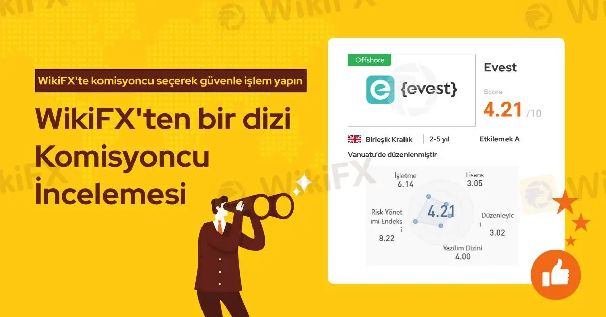 Evest resmi lisans sahibi bir forex komisyoncusudur ve WikiFX araştırmalarına göre bu firmanın lisansı geçerlidir. Ancak Evest firmasının lisansı offshore kayıtlı olduğu için, WikiFX yetkilileri bu firmayla ilgili olarak riskler görmektedir. Bundan dolayı WikiFX bu komisyoncuya 4.21/10 gibi orta seviye bir puan vermiştir.